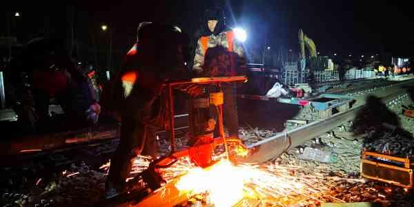 此次撥線工程軌道焊接作業(yè)南北端各1.3公里,12小時內(nèi)焊接完成22個焊頭、凍結(jié)接頭制作16個、低溫應(yīng)力放散800多米。