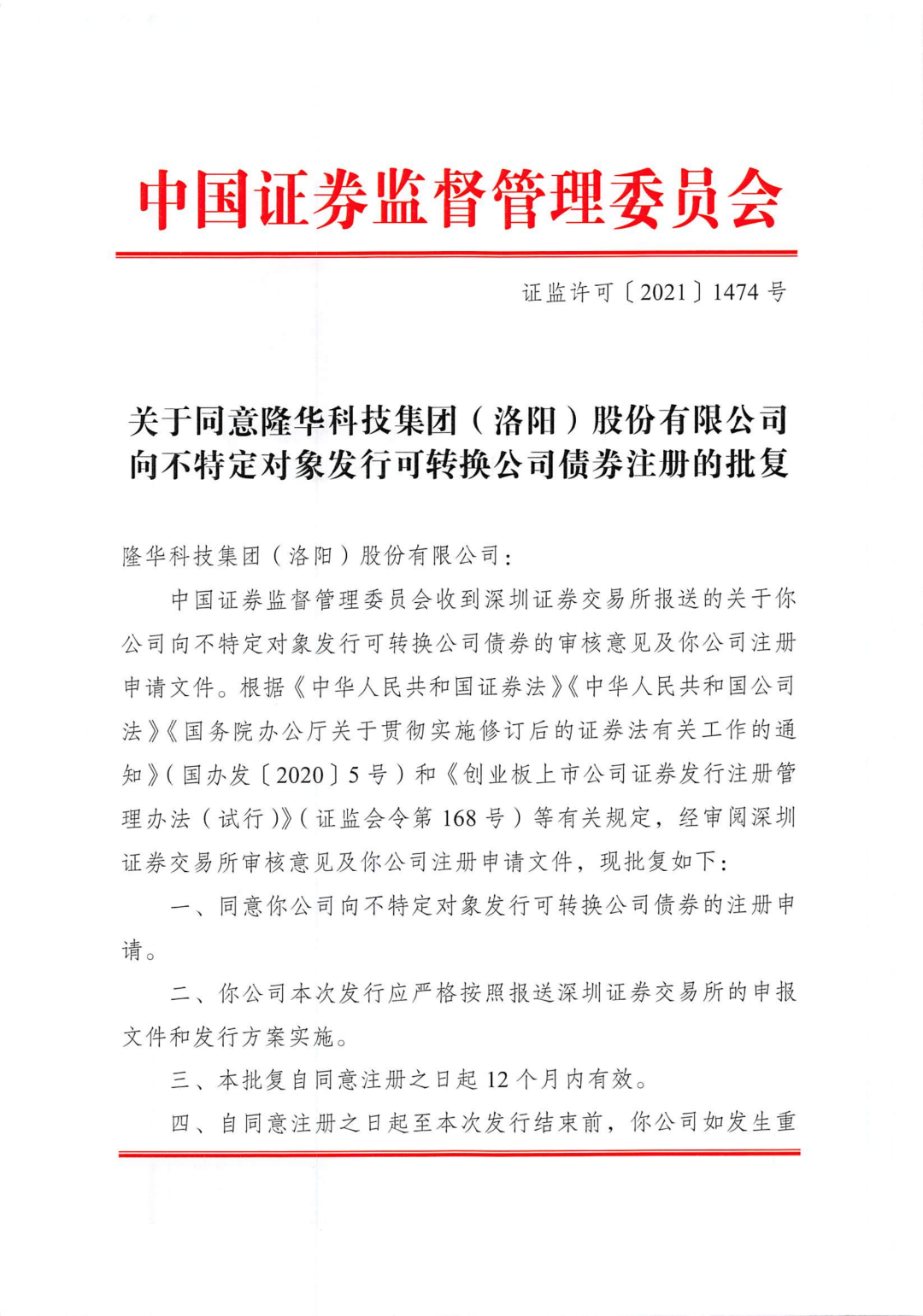 近日,隆華科技收到中國(guó)證券監(jiān)督管理委員會(huì)出具的《關(guān)于同意隆華科技集團(tuán)(洛陽(yáng))股份有限公司向不特定對(duì)象發(fā)行可轉(zhuǎn)換公司債券注冊(cè)的批復(fù)》(證監(jiān)許可〔2021〕1474號(hào))。